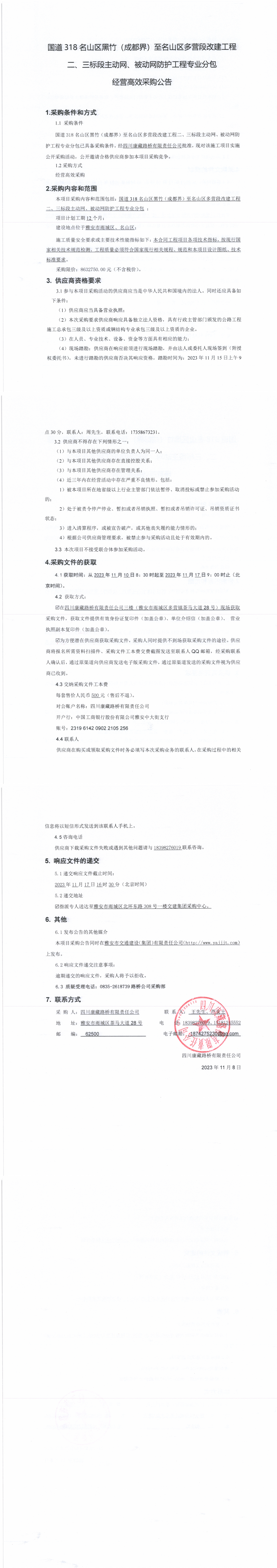 四川康藏路橋有限責(zé)任公司國道318名山區(qū)黑竹(成都界)至名山區(qū)多營段改建工程二、三標(biāo)段主動網(wǎng)、被動網(wǎng)防護工程專業(yè)分包經(jīng)營高效采購公告