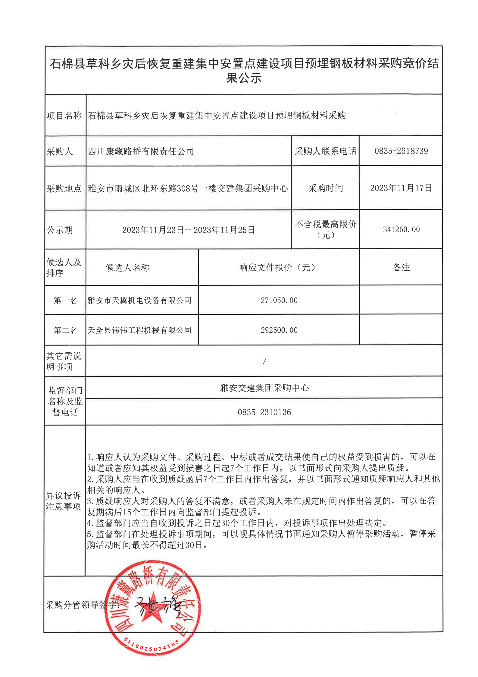 四川康藏路橋有限責(zé)任公司石棉縣草科鄉(xiāng)災(zāi)后恢復(fù)重建集中安置點(diǎn)建設(shè)項(xiàng)目預(yù)埋鋼板材料采購(gòu)結(jié)果公示