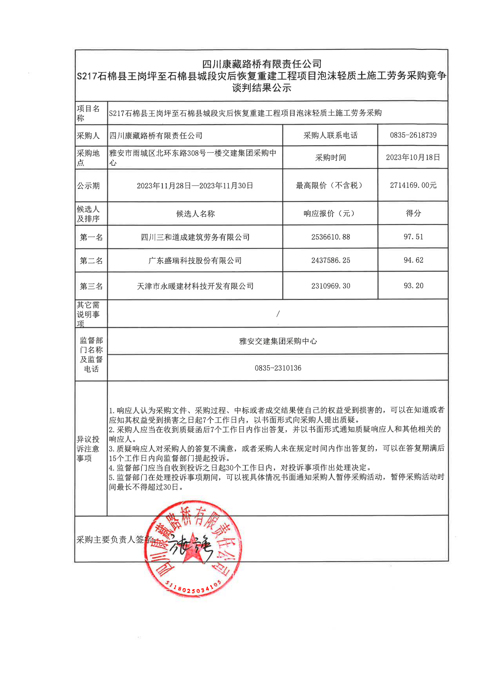 四川康藏路橋有限責(zé)任公司S217石棉縣王崗坪至石棉縣城段災(zāi)后恢復(fù)重建工程項(xiàng)目泡沫輕質(zhì)土施工勞務(wù)采購(gòu)結(jié)果公示