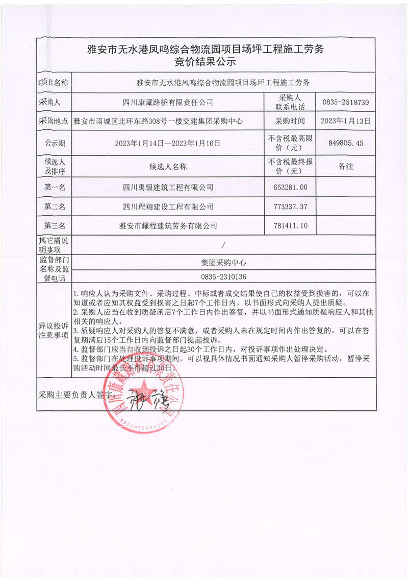 四川康藏路橋有限責任公司雅安市無水港鳳鳴綜合物流園項目場坪工程施工勞務競價結果公示