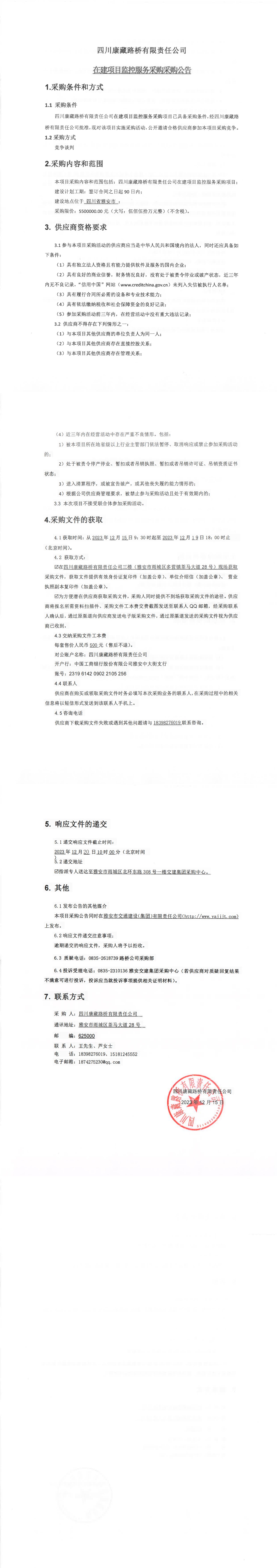 四川康藏路橋有限責(zé)任公司在建項(xiàng)目監(jiān)控服務(wù)采購(gòu)公告
