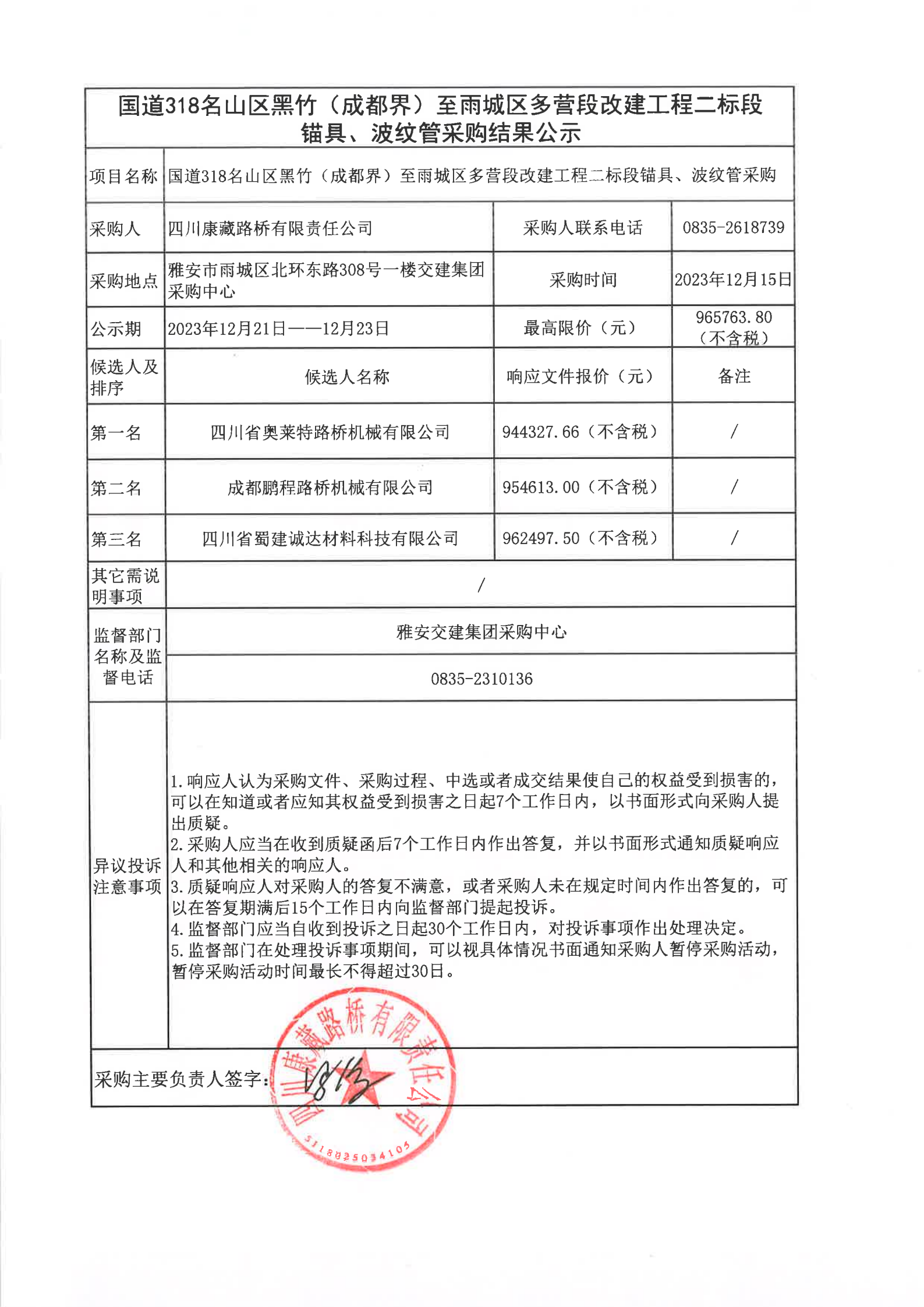 四川康藏路橋有限責(zé)任公司國道318名山區(qū)黑竹(成都界)至雨城區(qū)多營段改建工程二標(biāo)段錨具、波紋管采購結(jié)果公示
