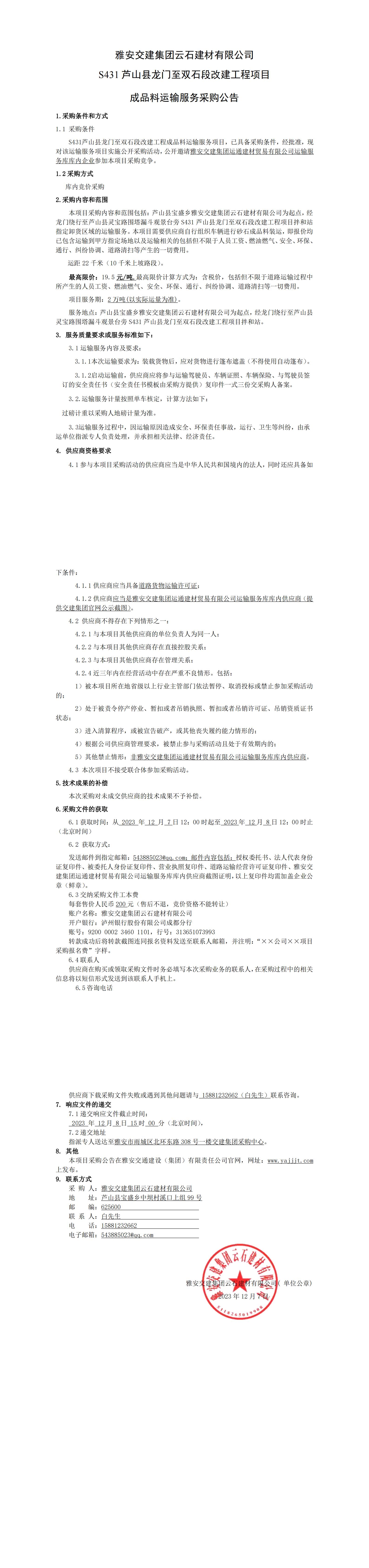 雅安交建集團云石建材有限公司S431蘆山縣龍門至雙石段改建工程項目成品料運輸服務采購公告