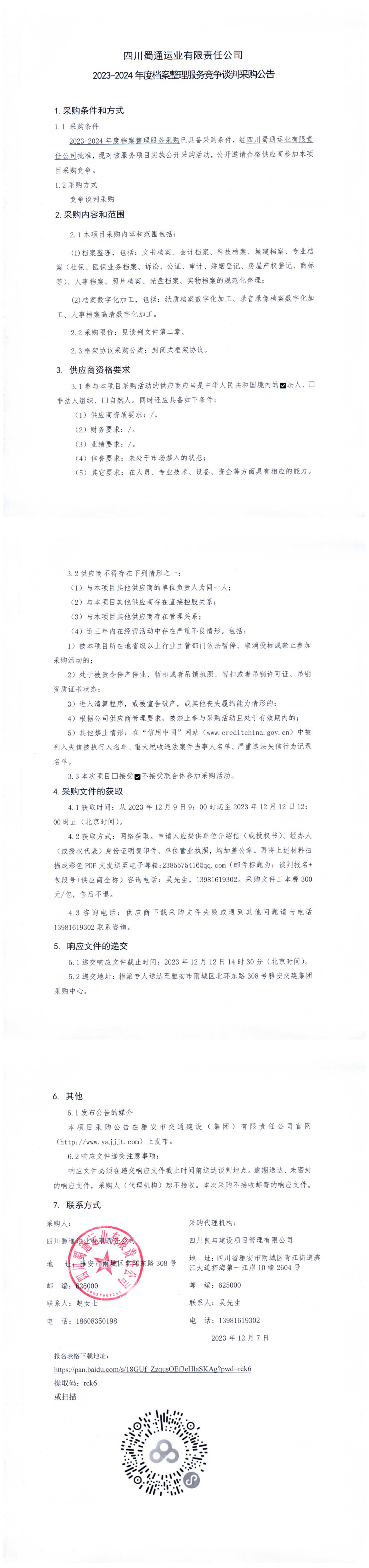 四川蜀通運(yùn)業(yè)有限責(zé)任公司2023-2024年度檔案整理服務(wù)競(jìng)爭(zhēng)談判采購(gòu)公告