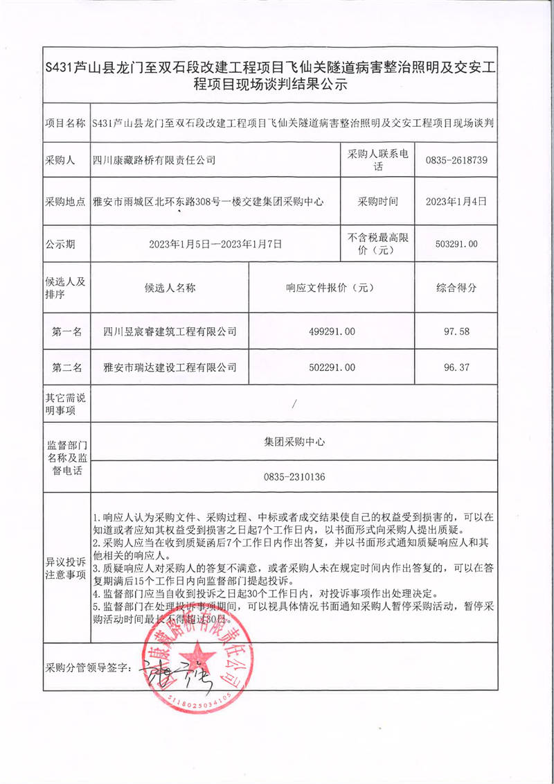四川康藏路橋有限責(zé)任公司S431蘆山縣龍門(mén)至雙石段改建工程項(xiàng)目飛仙關(guān)隧道病害整治照明及交安工程項(xiàng)目現(xiàn)場(chǎng)談判結(jié)果公示