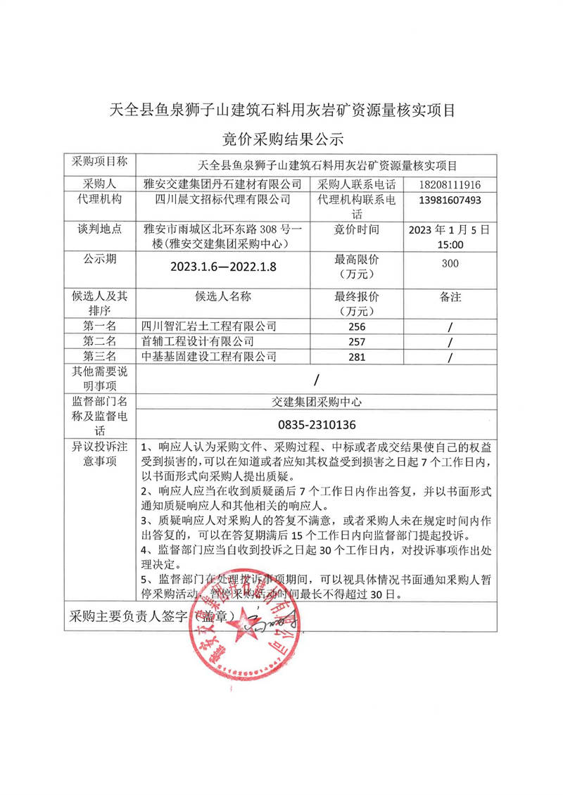 雅安交建集團(tuán)丹石建材有限公司天全縣魚泉獅子山建筑石料用灰?guī)r礦資源量核實(shí)項(xiàng)目競(jìng)價(jià)采購(gòu)結(jié)果公示