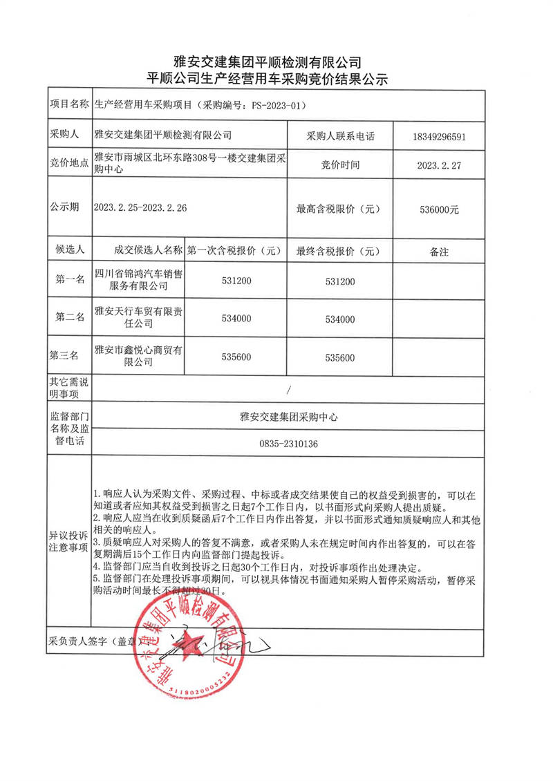 雅安交建集團平順檢測有限公司平順公司生產(chǎn)經(jīng)營用車采購競價結(jié)果公示