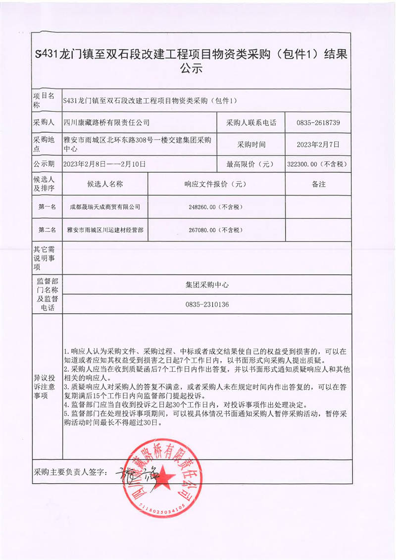 四川康藏路橋有限責(zé)任公司S431龍門(mén)鎮(zhèn)至雙石段改建工程項(xiàng)目物資類(lèi)采購(gòu)(包件1、包件2)結(jié)果公示