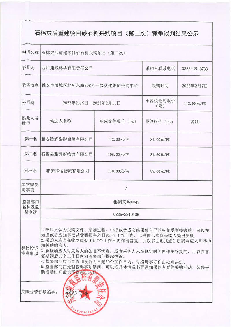 四川康藏路橋有限責任公司石棉災后重建項目砂石料采購項目(第二次)競爭談判結(jié)果公示