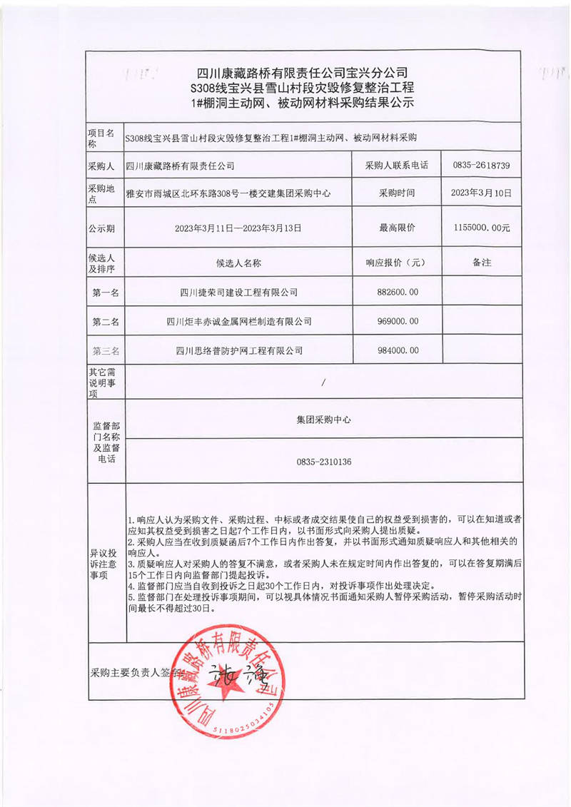 四川康藏路橋有限責任公司寶興分公司S308線寶興縣雪山村段災(zāi)毀修復(fù)整治工程1#棚洞主動網(wǎng)、被動網(wǎng)材料采購結(jié)果公示