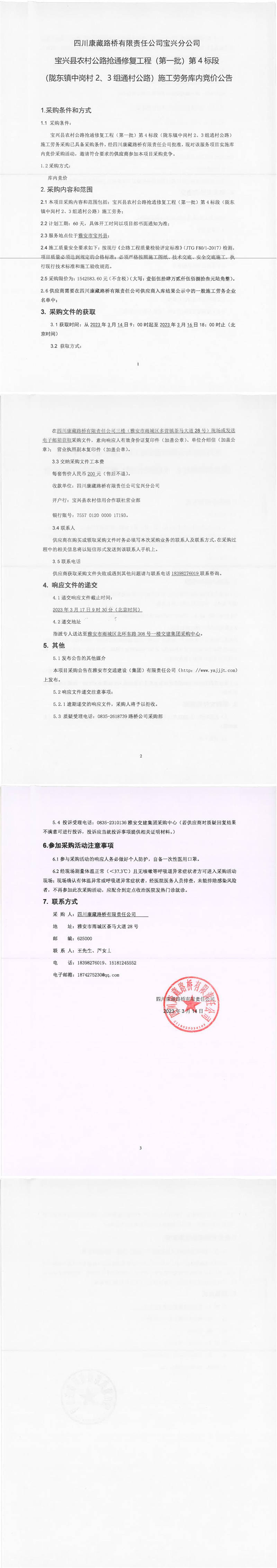 四川康藏路橋有限責(zé)任公司寶興分公司寶興縣農(nóng)村公路搶通修復(fù)工程(第一批)第4標(biāo)段(隴東鎮(zhèn)中崗村2、3組通村公路)施工勞務(wù)庫內(nèi)競價(jià)公告