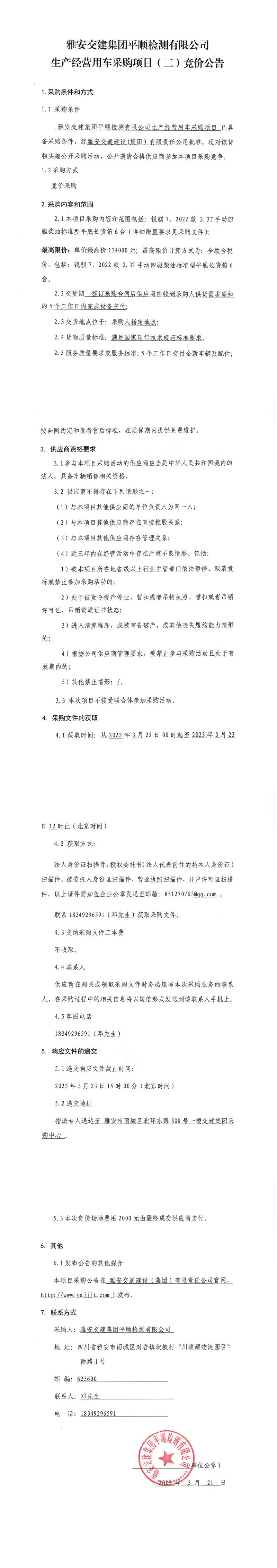 雅安交建集團平順檢測有限公司平順公司生產經營用車采購項目(二)競價公告