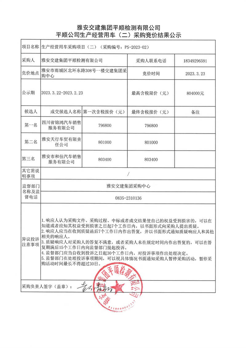 雅安交建集團(tuán)平順檢測(cè)有限公司平順公司生產(chǎn)經(jīng)營(yíng)用車(三)采購(gòu)競(jìng)價(jià)結(jié)果公示