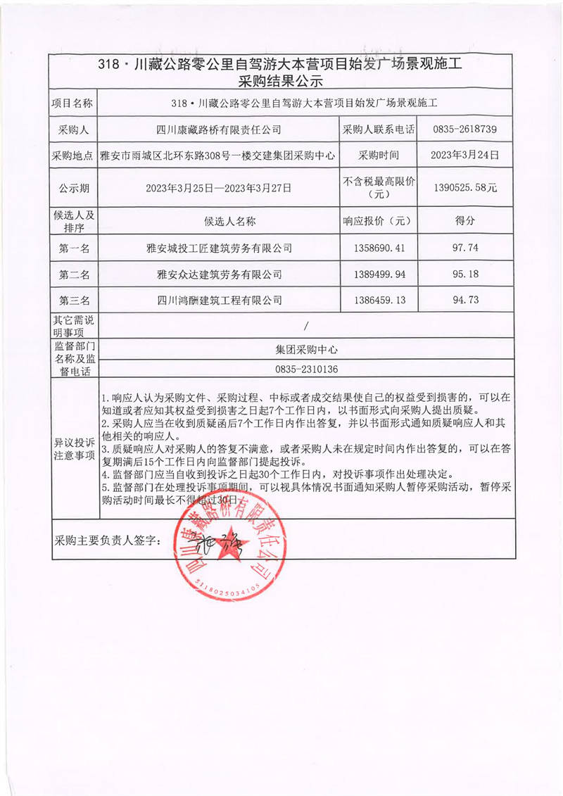 四川康藏路橋有限責(zé)任公司318·川藏公路零公里自駕游大本營項(xiàng)目始發(fā)廣場(chǎng)景觀施工采購結(jié)果公示