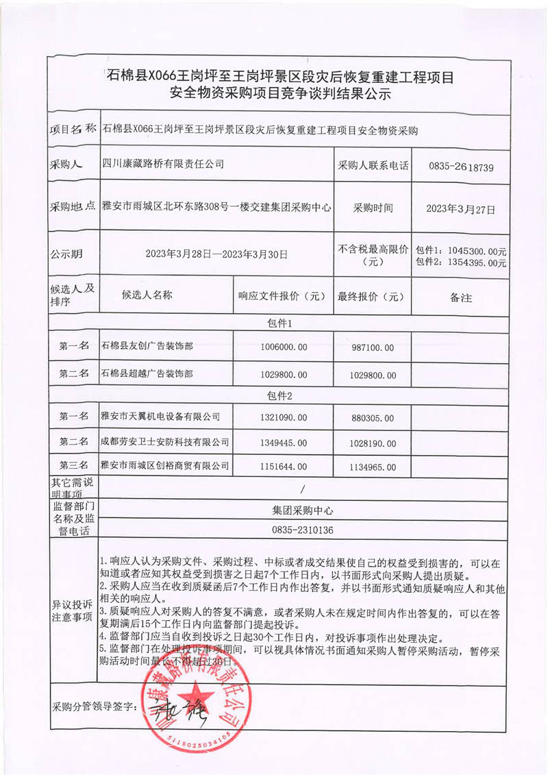 四川康藏路橋有限責(zé)任公司石棉縣X066王崗坪至王崗坪景區(qū)段災(zāi)后恢復(fù)重建工程項(xiàng)目安全物資采購項(xiàng)目競爭談判結(jié)果公示