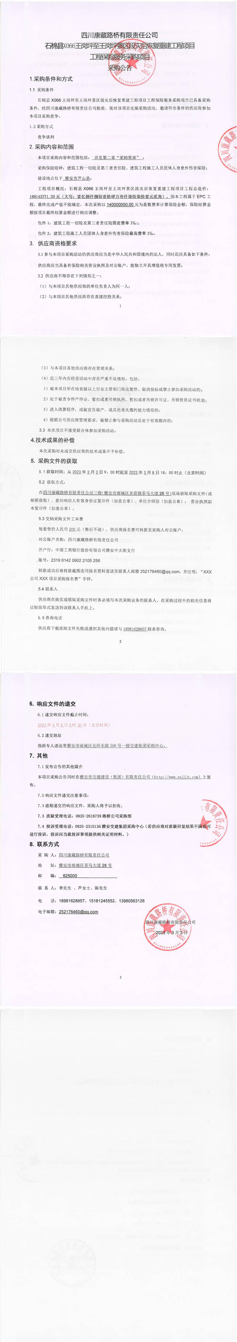 四川康藏路橋有限責(zé)任公司石棉縣X066王崗坪至王崗坪景區(qū)段災(zāi)后恢復(fù)重建工程項目工程保險服務(wù)采購公告
