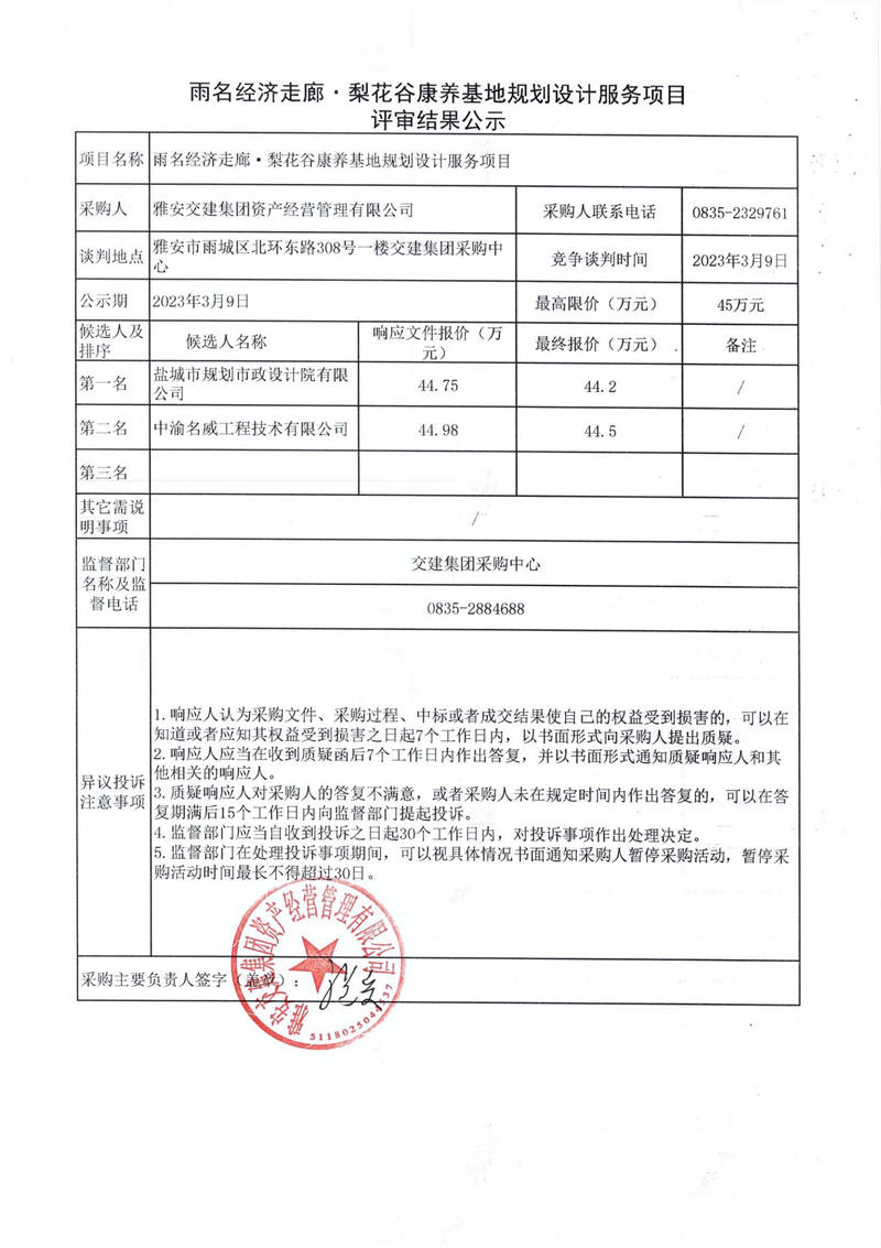 雅安交建集團(tuán)資產(chǎn)經(jīng)營管理有限公司雨名經(jīng)濟(jì)走廊·梨花谷康養(yǎng)基地規(guī)劃設(shè)計服務(wù)項目采購結(jié)果公示
