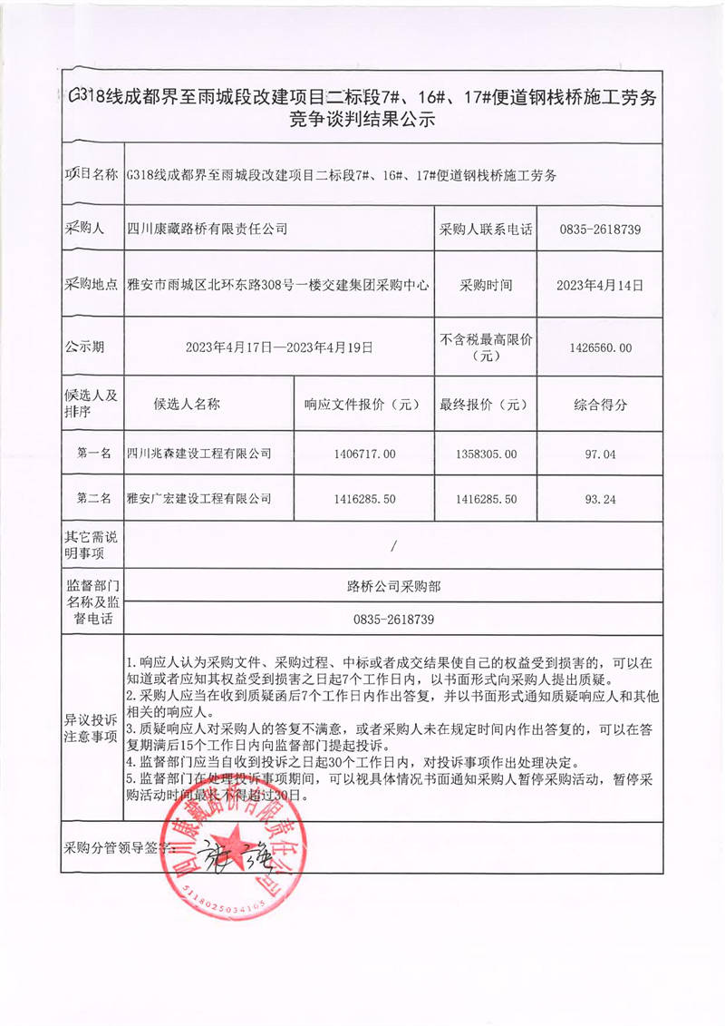 四川康藏路橋有限責(zé)任公司G318線成都至雨城段改建項目二標(biāo)段7#、16#、17#便道鋼棧橋施工勞務(wù)競爭談判結(jié)果公示