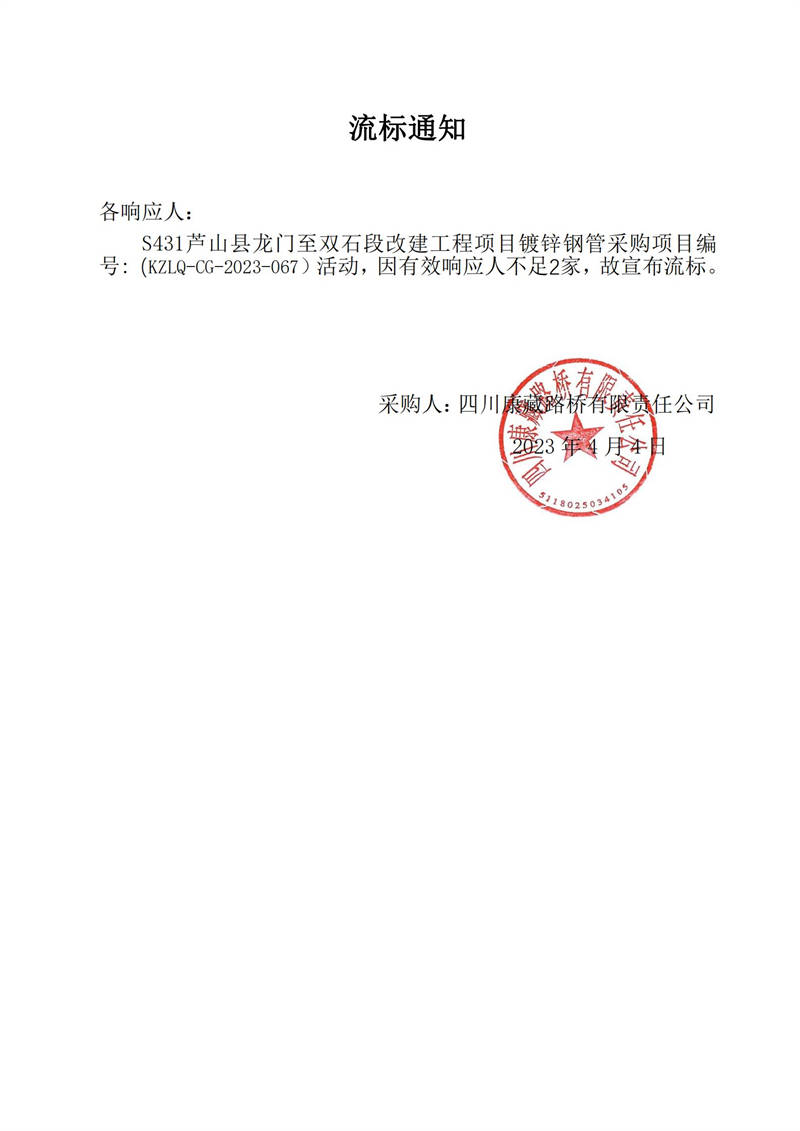 四川康藏路橋有限責(zé)任公司S431蘆山縣龍門至雙石段改建工程項(xiàng)目鍍鋅鋼管采購(gòu)流標(biāo)通知