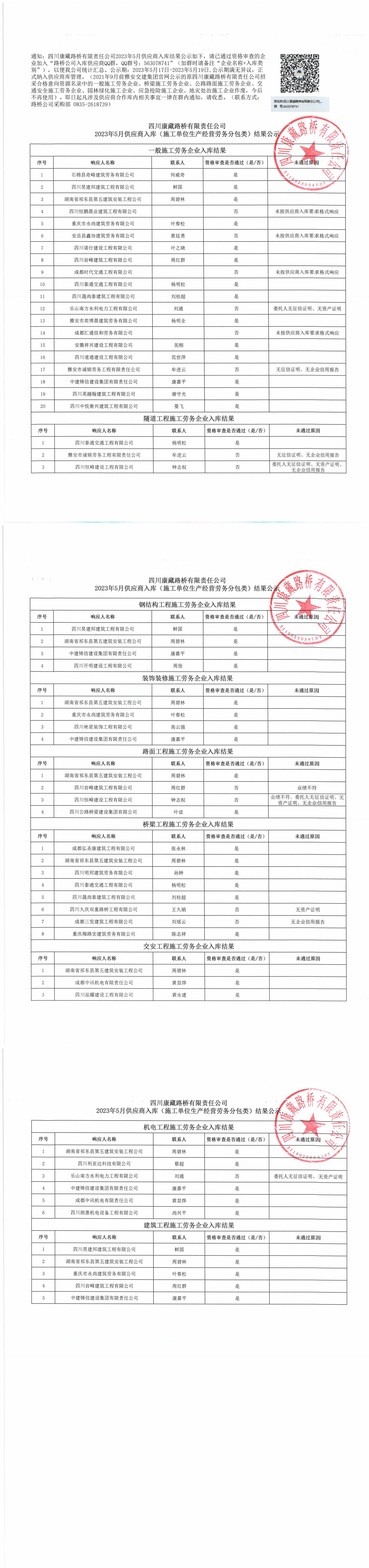 四川康藏路橋有限責任公司2023年5月供應(yīng)商入庫(施工單位生產(chǎn)經(jīng)營勞務(wù)分包類)結(jié)果公示