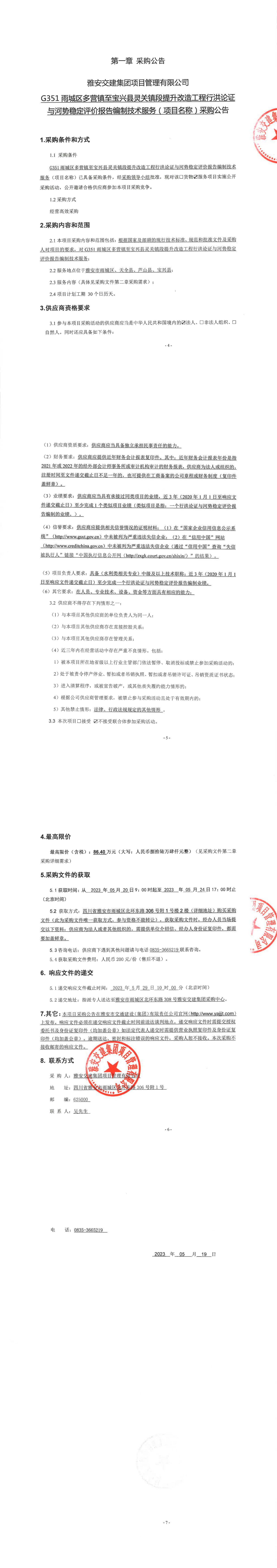 雅安交建集團項目管理有限公司G351雨城區(qū)多營鎮(zhèn)至寶興縣靈關(guān)鎮(zhèn)段提升改造工程行洪論證與河勢穩(wěn)定評價報告編制技術(shù)服務(wù)(項目名稱)采購公告