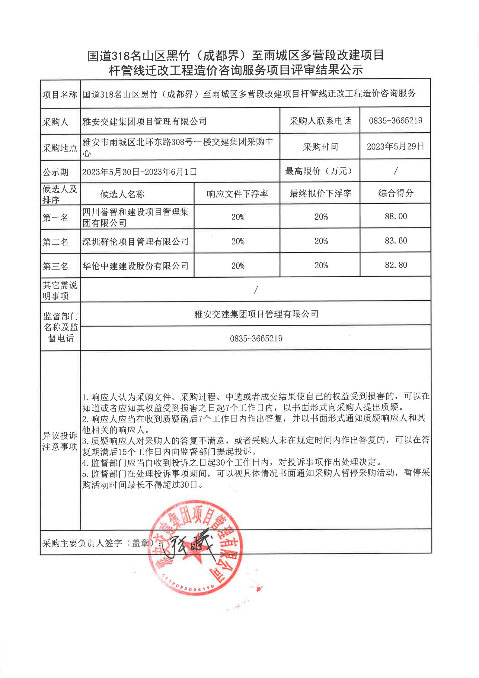 雅安交建集團(tuán)項(xiàng)目管理有限公司國道318名山區(qū)黑竹(成都界)至雨城區(qū)多營段改建項(xiàng)目桿管線遷改工程造價(jià)咨詢服務(wù)項(xiàng)目評(píng)審結(jié)果公示