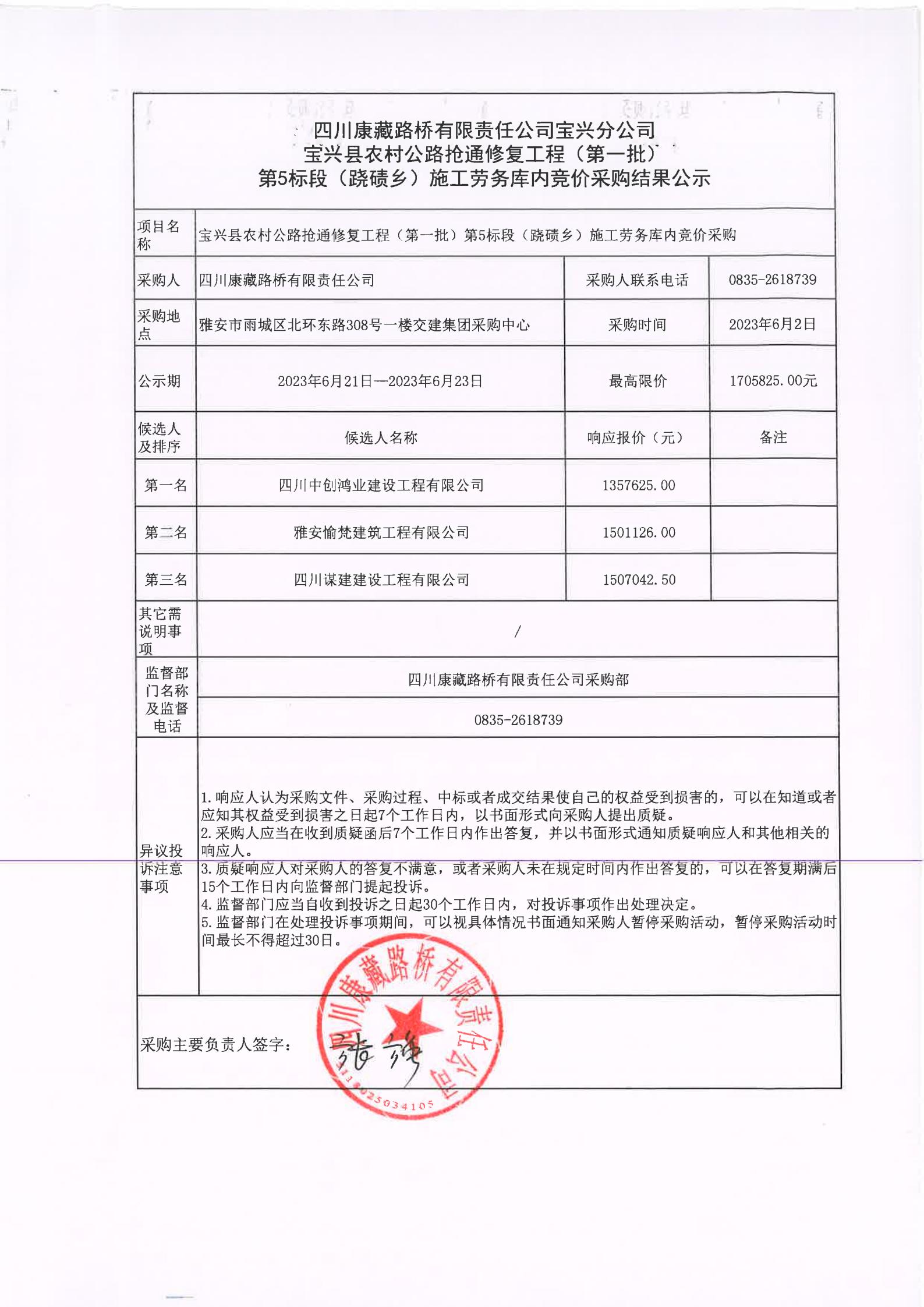四川康藏路橋有限責任公司寶興分公司寶興縣農村公路搶通修復工程(第一批)第5標段(蹺磧鄉(xiāng))施工勞務庫內競價采購結果公示