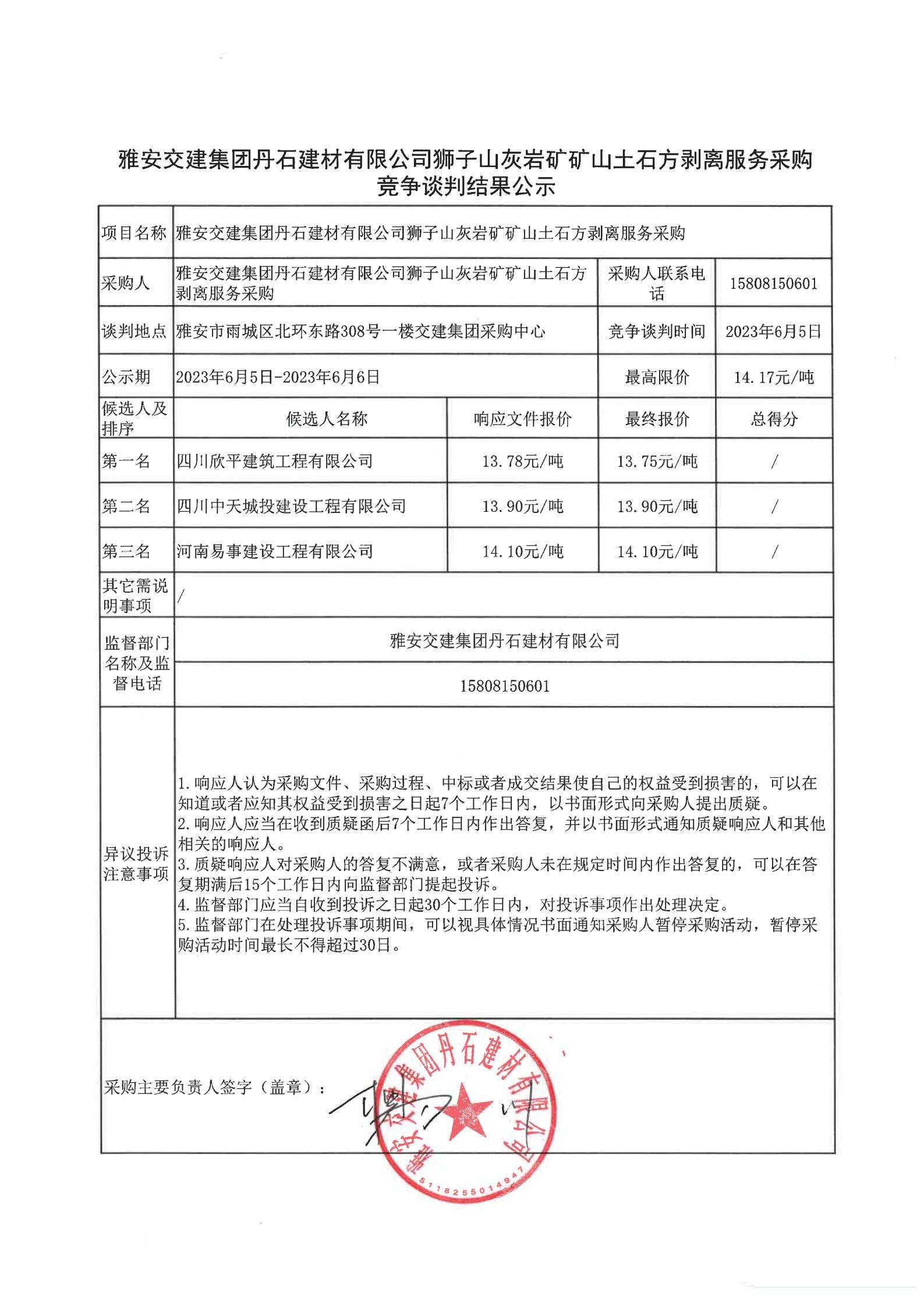 雅安交建集團(tuán)丹石建材有限公司獅子山灰?guī)r礦礦山土石方剝離服務(wù)采購(gòu)競(jìng)爭(zhēng)談判結(jié)果公示