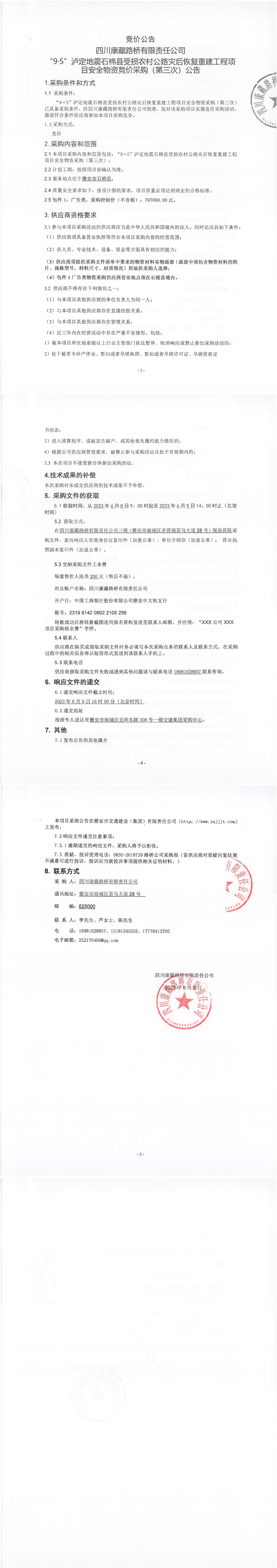 四川康藏路橋有限責任公司“9·5”瀘定地震石棉縣受損農(nóng)村公路災后恢復重建工程項目安全物資競價采購(第三次)公告