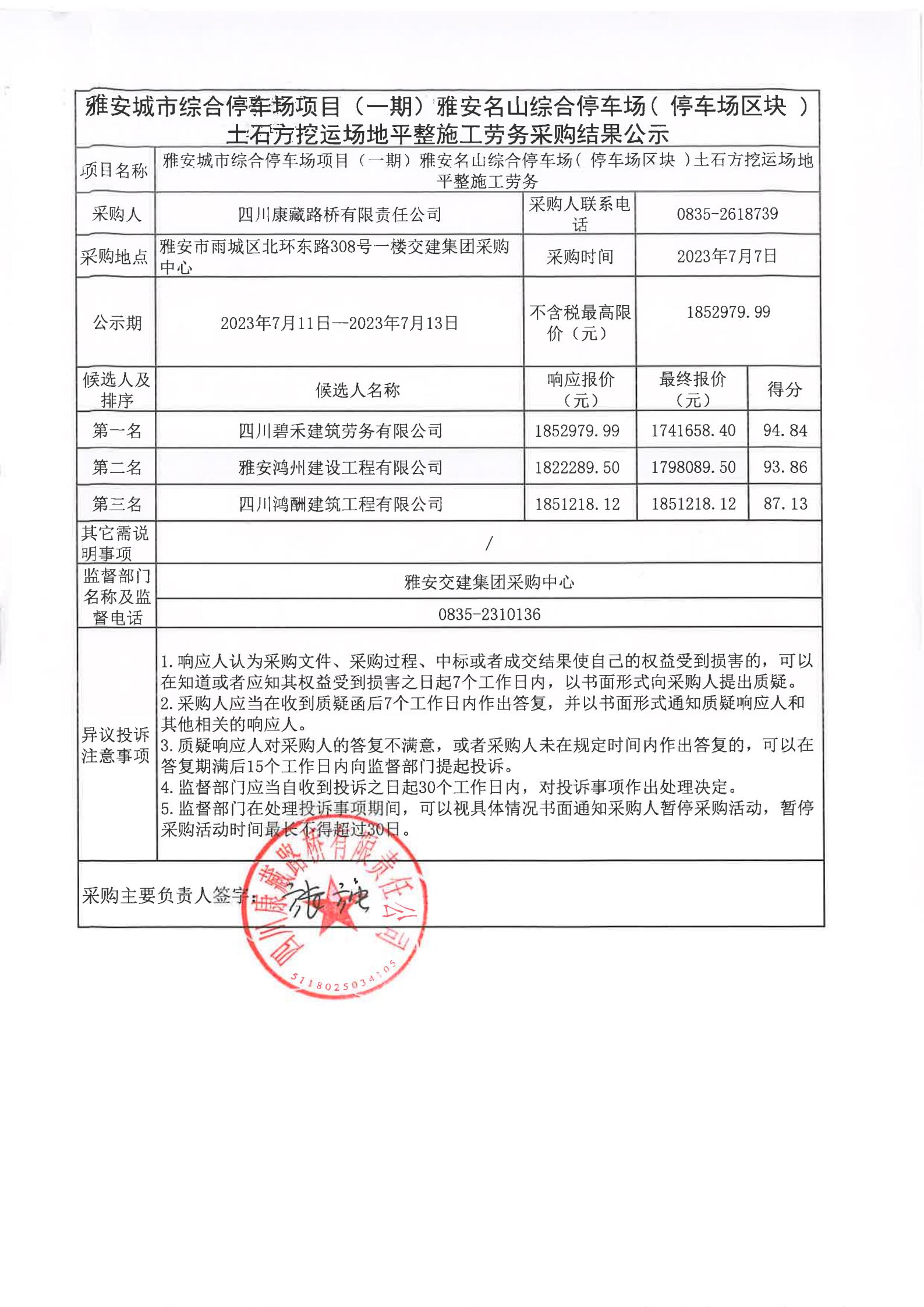 四川康藏路橋有限責任公司雅安城市綜合停車場項目(一期)雅安名山綜合停車場(停車場區(qū)塊)土石方挖運場地平整施工勞務采購結果公示