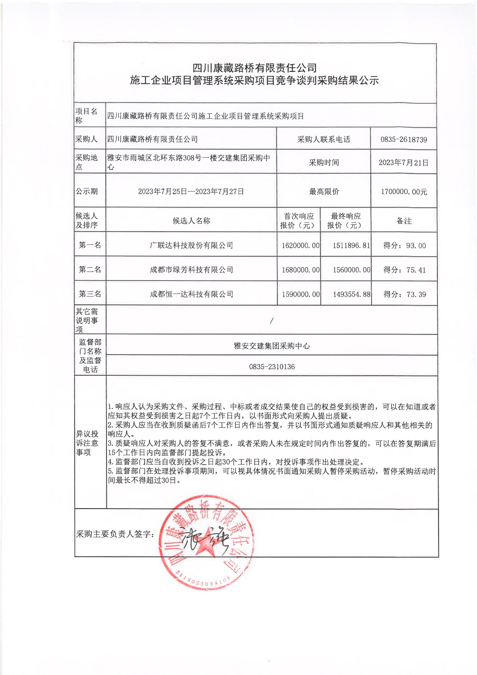 四川康藏路橋有限責(zé)任公司施工企業(yè)項(xiàng)目管理系統(tǒng)采購項(xiàng)目競(jìng)爭(zhēng)談判采購結(jié)果公示