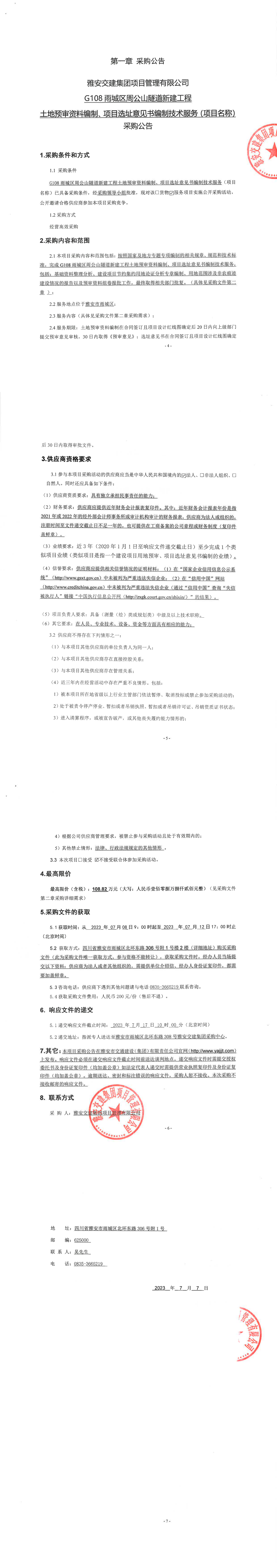 雅安交建集團(tuán)項(xiàng)目管理有限公司G108雨城區(qū)周公山隧道新建工程土地預(yù)審資料編制、項(xiàng)目選址意見書編制技術(shù)服務(wù)(項(xiàng)目名稱)采購公告