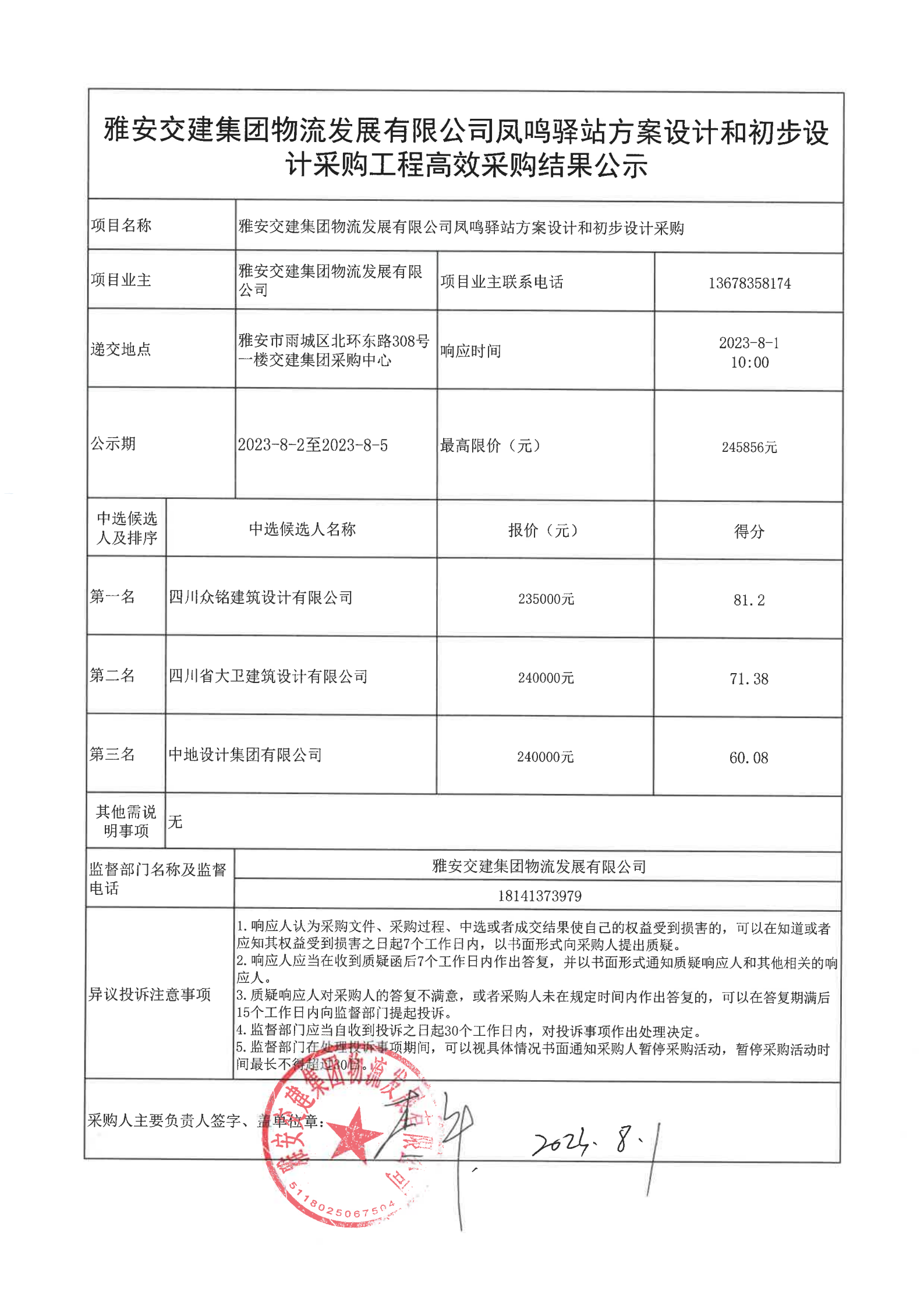 雅安交建集團物流發(fā)展有限公司鳳鳴驛站方案設計和初步設計采購工程高效采購結果公示