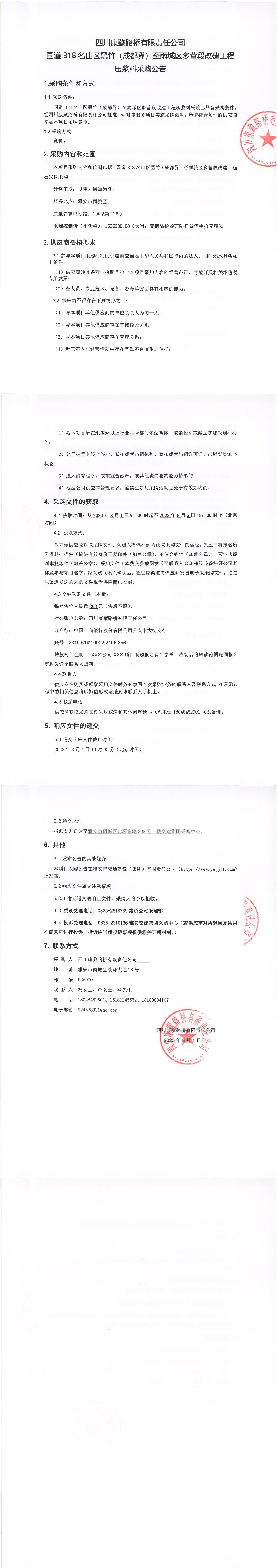 四川康藏路橋有限責任公司國道318名山區(qū)黑竹(成都界)至雨城區(qū)多營段改建工程壓漿料采購公告