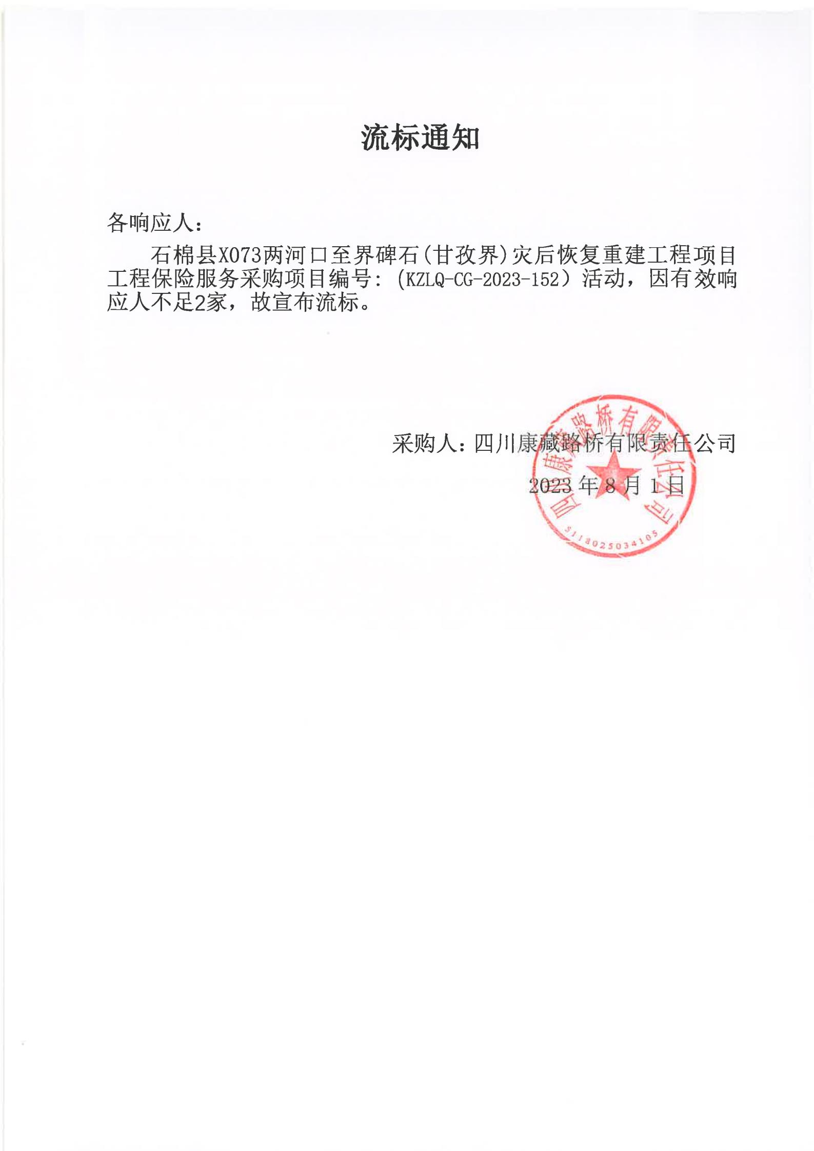 四川康藏路橋有限責任公司石棉分公司石棉縣X073兩河口至界碑石(甘孜界)災后恢復重建工程項目工程保險服務采購項目流標通知