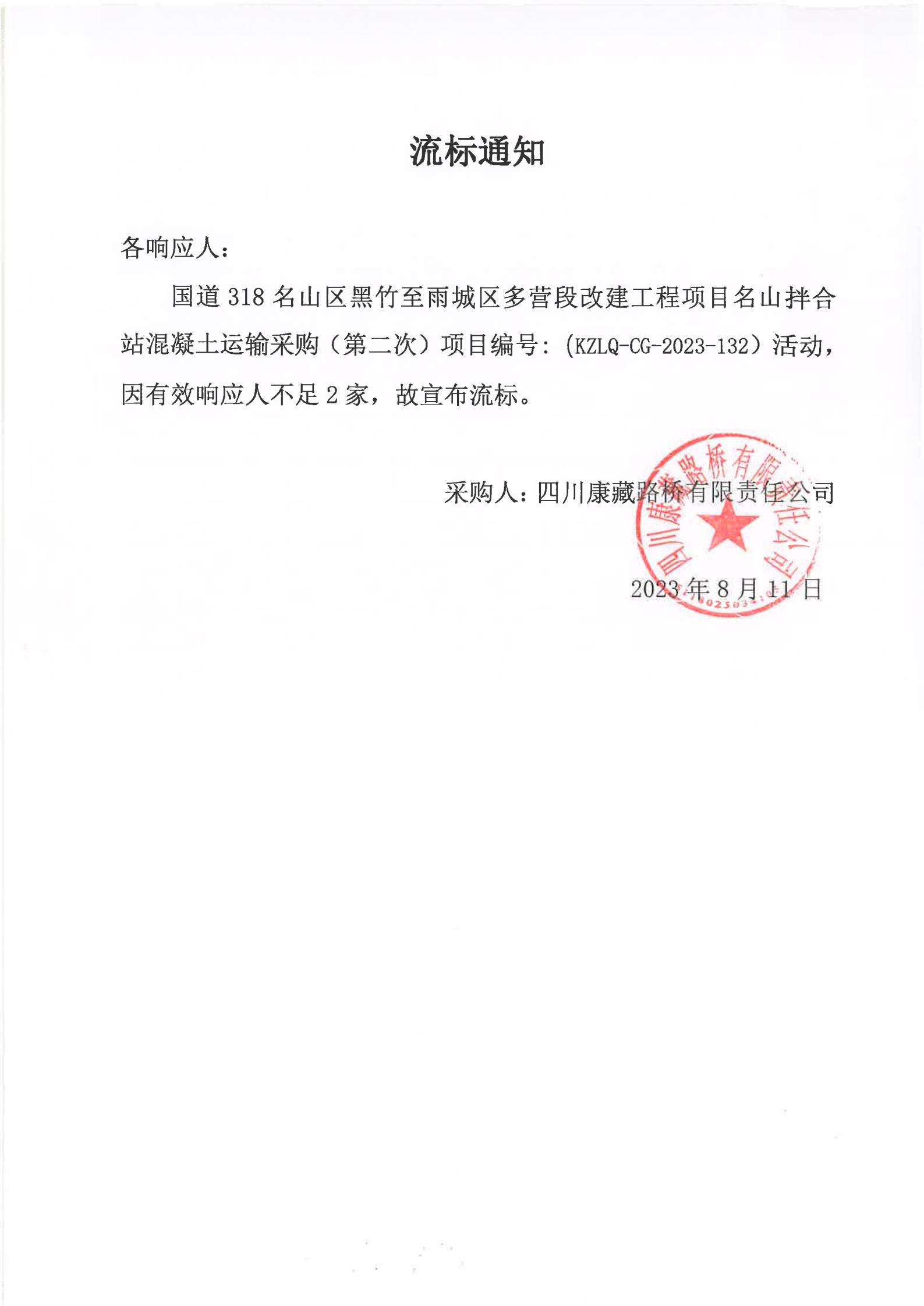 四川康藏路橋有限責(zé)任公司國道318名山區(qū)黑竹至雨城區(qū)多營段改建工程項目名山拌合站混凝土運輸服務(wù)(第二次)流標(biāo)通知)