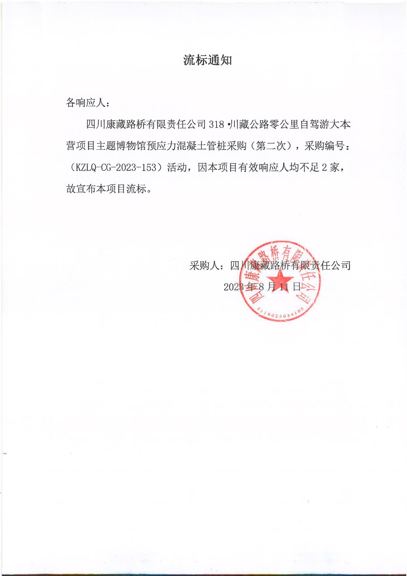 四川康藏路橋有限責(zé)任公司318·川藏公路零公里自駕游大本營項目主題博物館預(yù)應(yīng)力混凝土管樁采購(第二次)流標通知