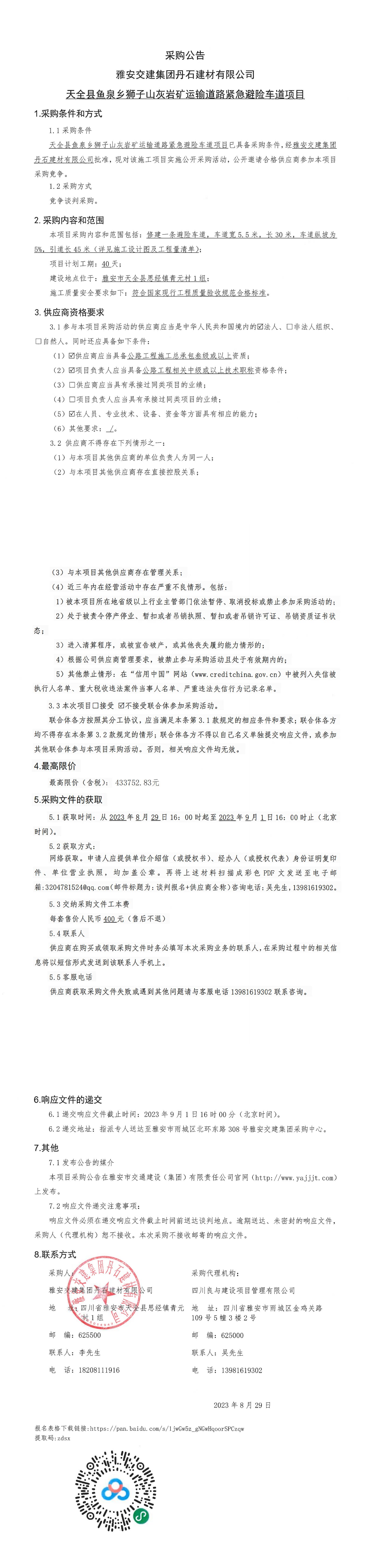 雅安交建集團(tuán)丹石建材有限公司天全縣魚泉鄉(xiāng)獅子山灰?guī)r礦運(yùn)輸?shù)缆肪o急避險(xiǎn)車道項(xiàng)目采購公告