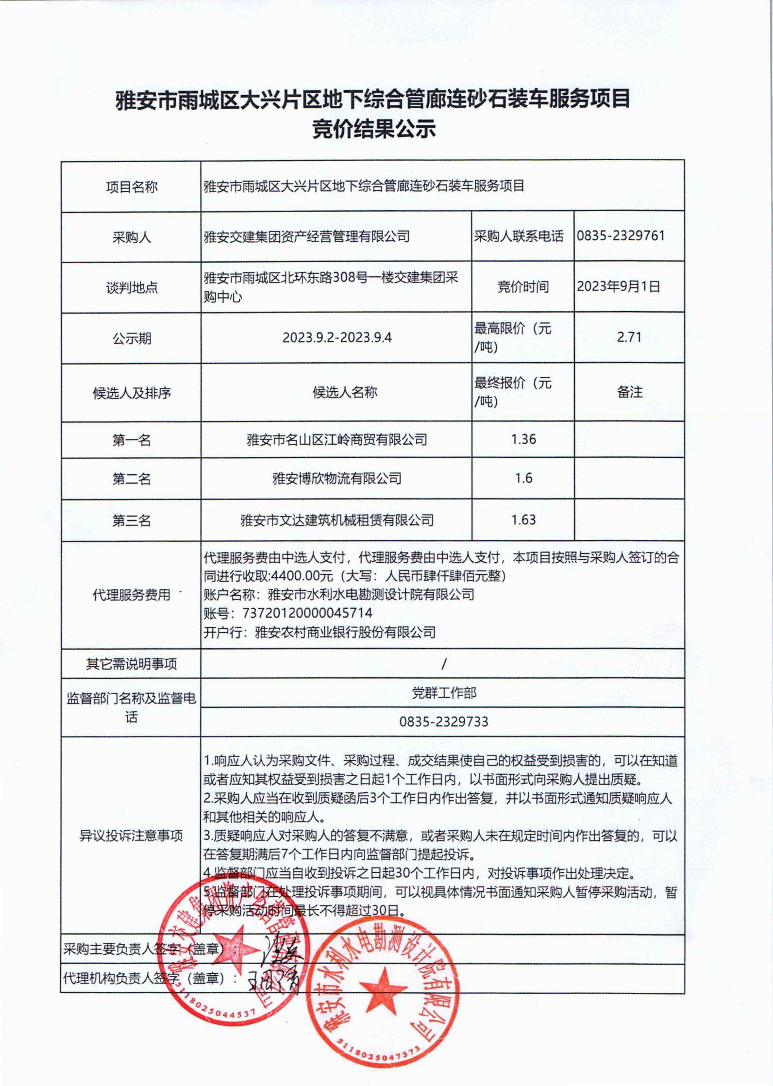 雅安交建集團資產(chǎn)經(jīng)營管理有限公司大興片區(qū)地下綜合管廊連砂石裝車服務(wù)項目競價結(jié)果公示