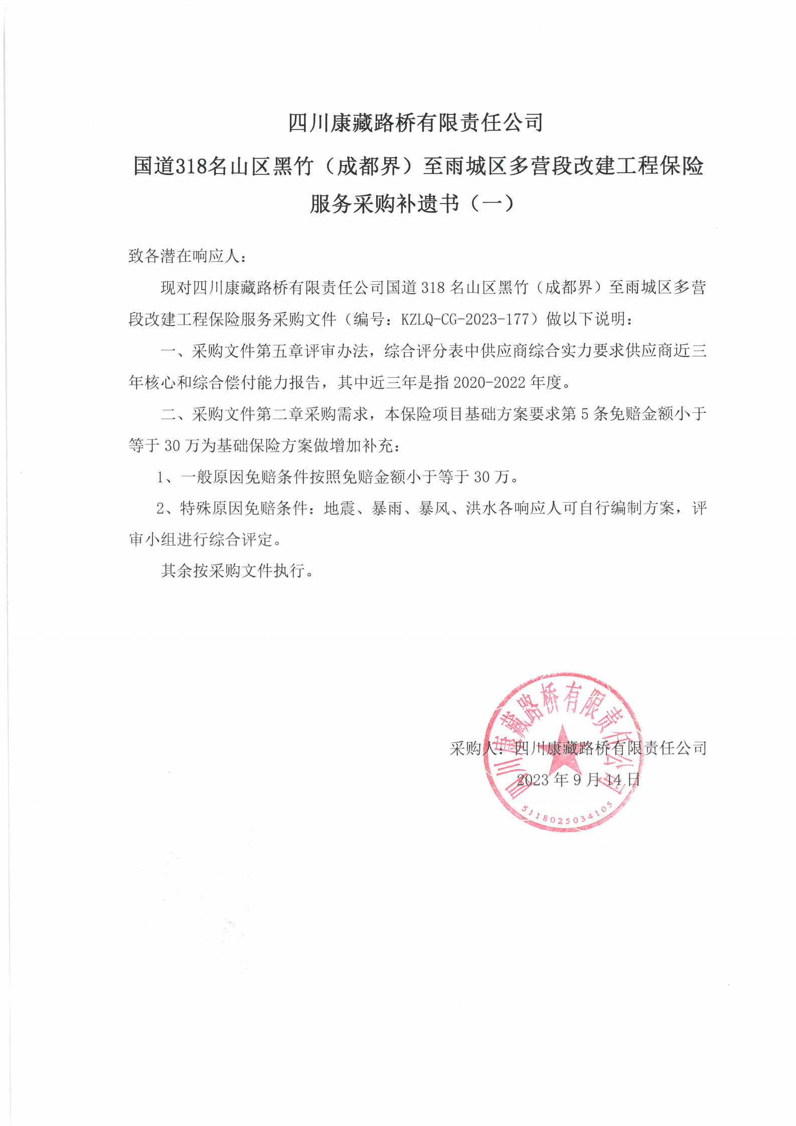 四川康藏路橋有限責(zé)任公司國道318名山區(qū)黑竹(成都界)至雨城區(qū)多營段改建工程保險服務(wù)采購補(bǔ)遺書(一)