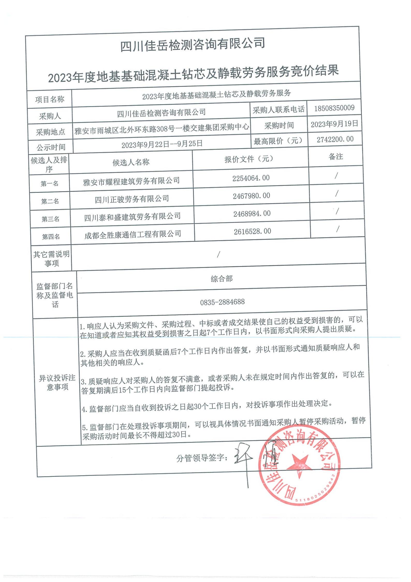 四川佳岳檢測咨詢有限公司2023年度地基基礎混凝土鉆芯及靜載勞務庫內競價結果