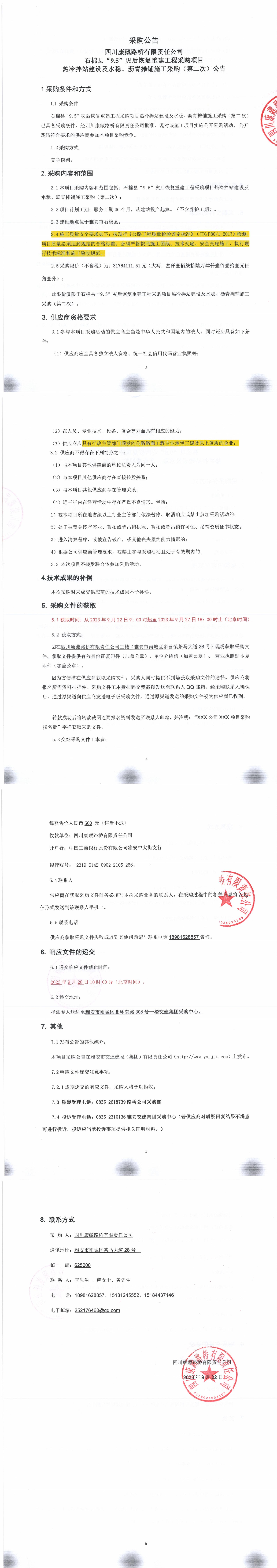 四川康藏路橋有限責(zé)任公司石棉縣“9·5”災(zāi)后恢復(fù)重建工程采購項(xiàng)目熱冷拌站建設(shè)及水穩(wěn)、瀝青攤鋪施工采購(第二次)公告