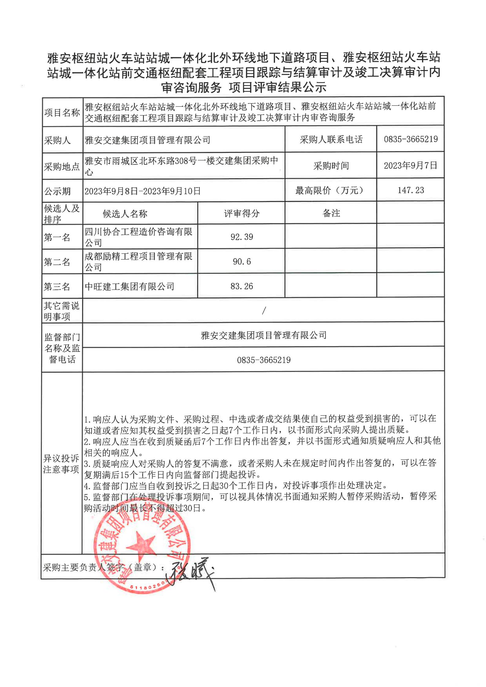 雅安交建集團項目管理有限公司雅安樞紐站火車站站城一體化北外環(huán)線地下道路項目、樞紐站火車站站成一體化站前交通樞紐配套工程項目跟蹤與結算審計及竣工決算審計內(nèi)審咨詢服務項目評審結果公示