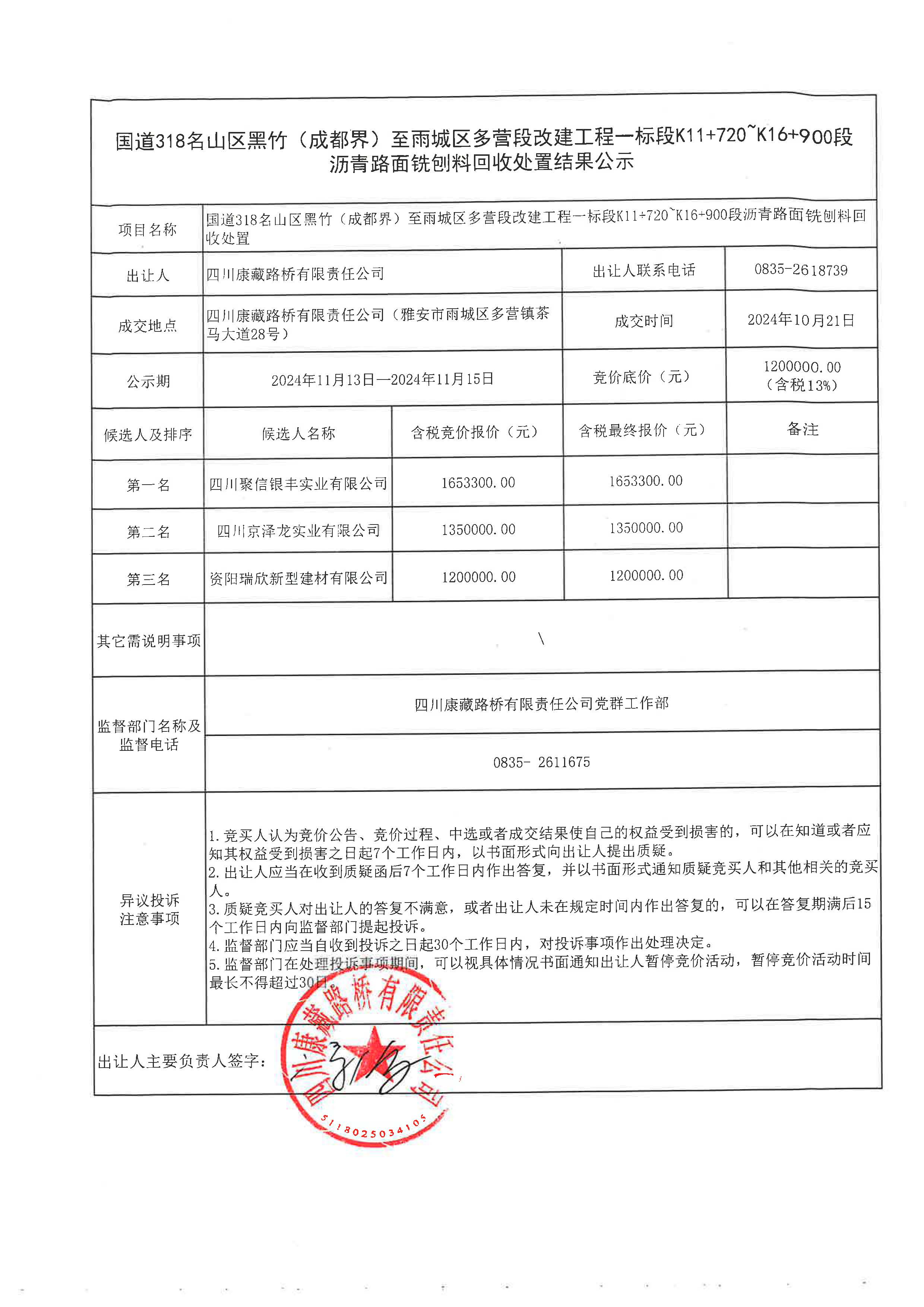 四川康藏路橋有限責(zé)任公司國道318名山區(qū)黑竹(成都界)至雨城區(qū)多營段改建工程一標(biāo)段K11+720~K16+900段瀝青路面銑刨料回收處置結(jié)果公示