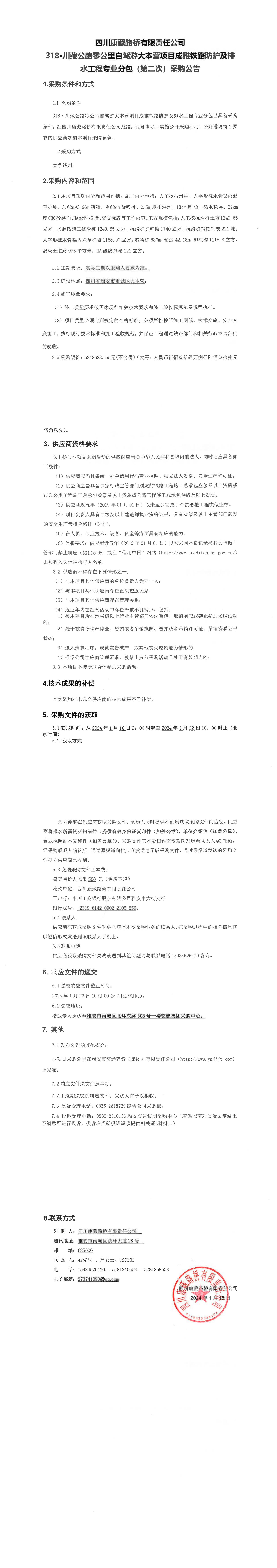 四川康藏路橋有限責任公司318·川藏公路零公里自駕游大本營項目成雅鐵路防護及排水工程專業(yè)分包(第二次)采購公告