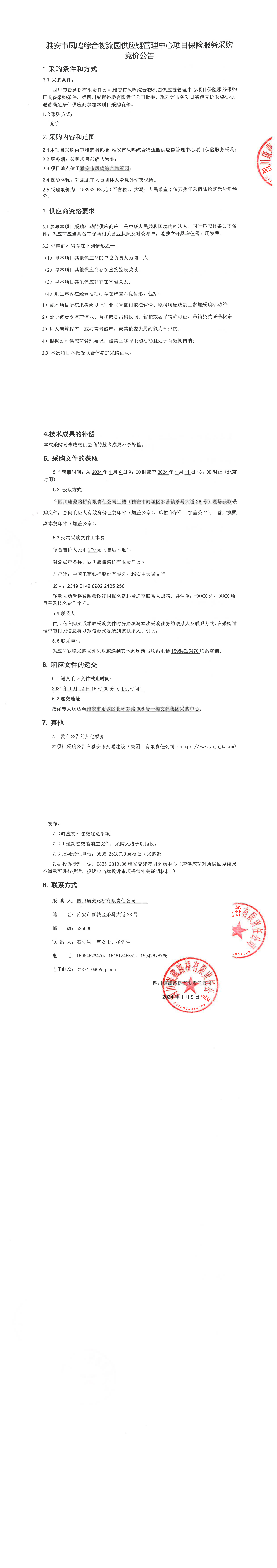 四川康藏路橋有限責任公司雅安鳳鳴綜合物流園供應鏈管理中心項目保險服務采購競價公告