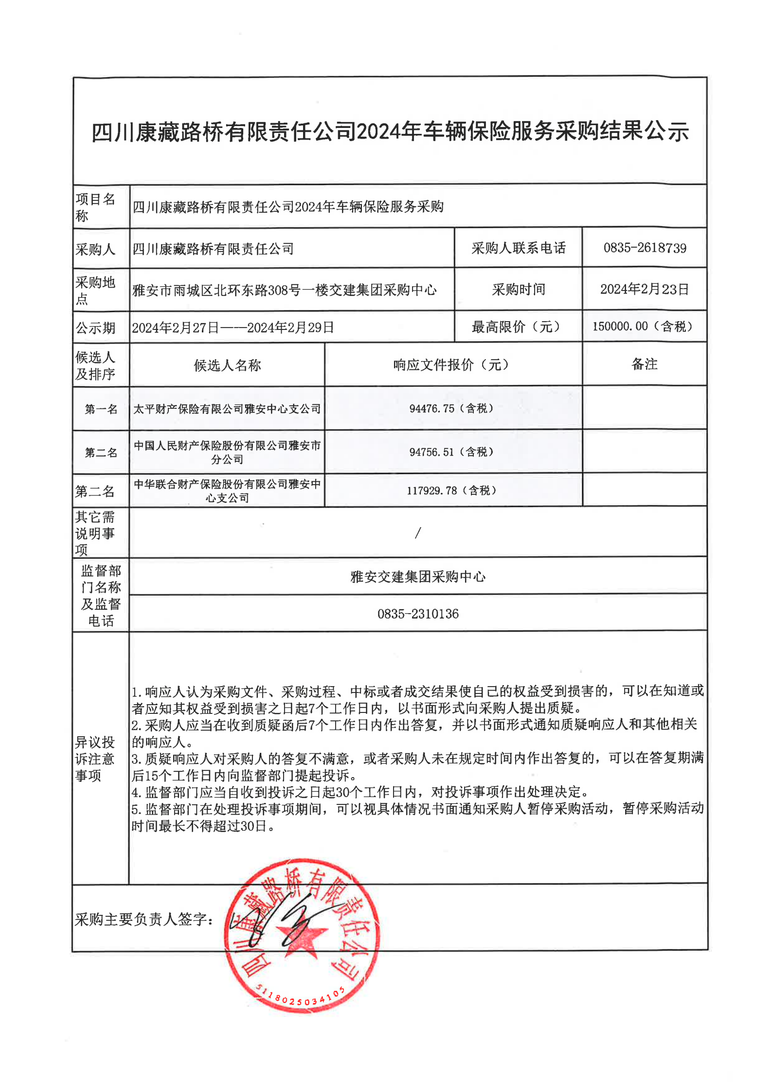 四川康藏路橋有限責任公司2024年車輛保險服務采購結(jié)果公示