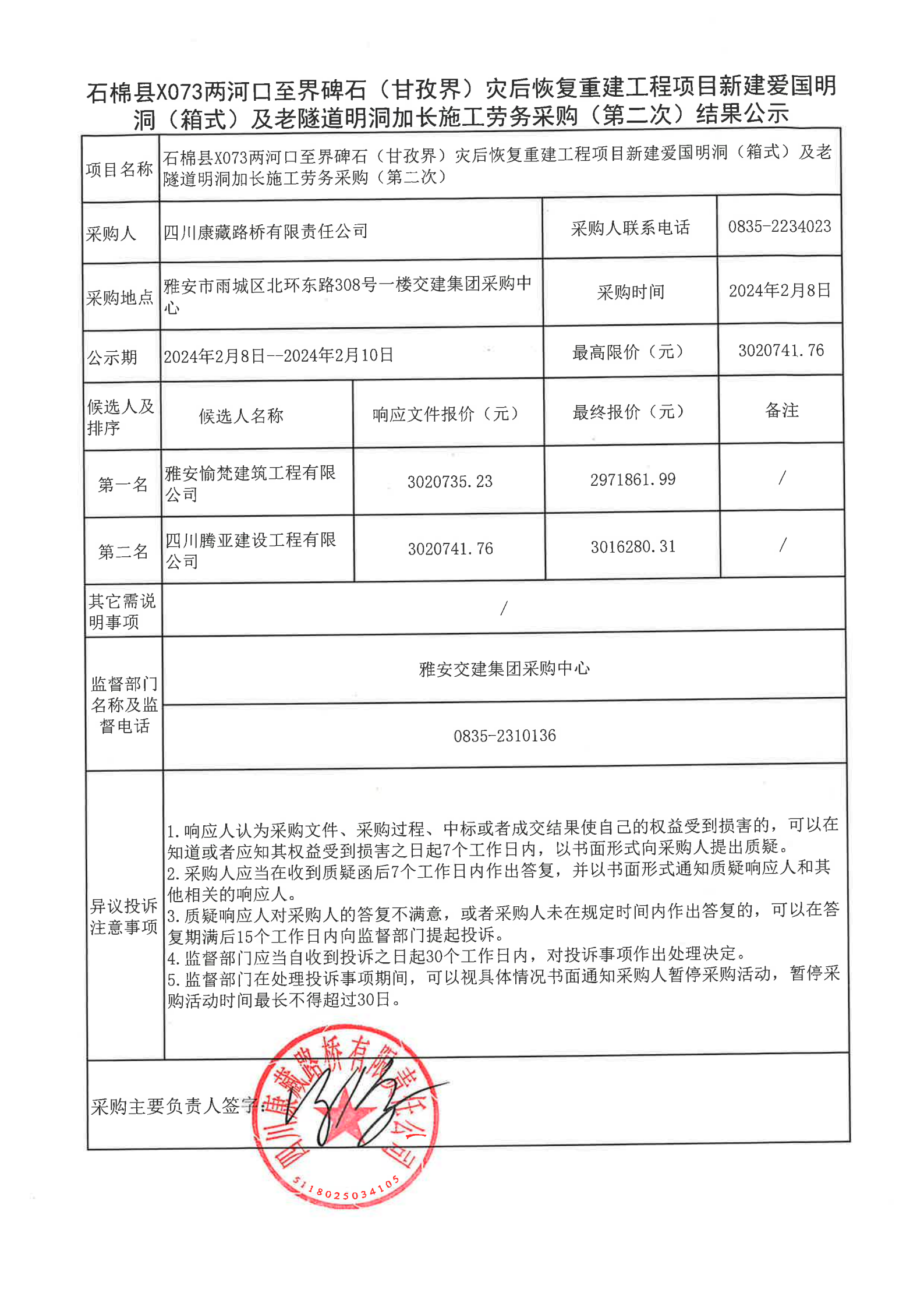 四川康藏路橋有限責(zé)任公司石棉縣X073兩河口至界碑石(甘孜界)災(zāi)后恢復(fù)重建工程項(xiàng)目新建愛國(guó)明洞(箱式)及老隧道明洞加長(zhǎng)施工勞務(wù)采購(gòu)(第二次)結(jié)果公示