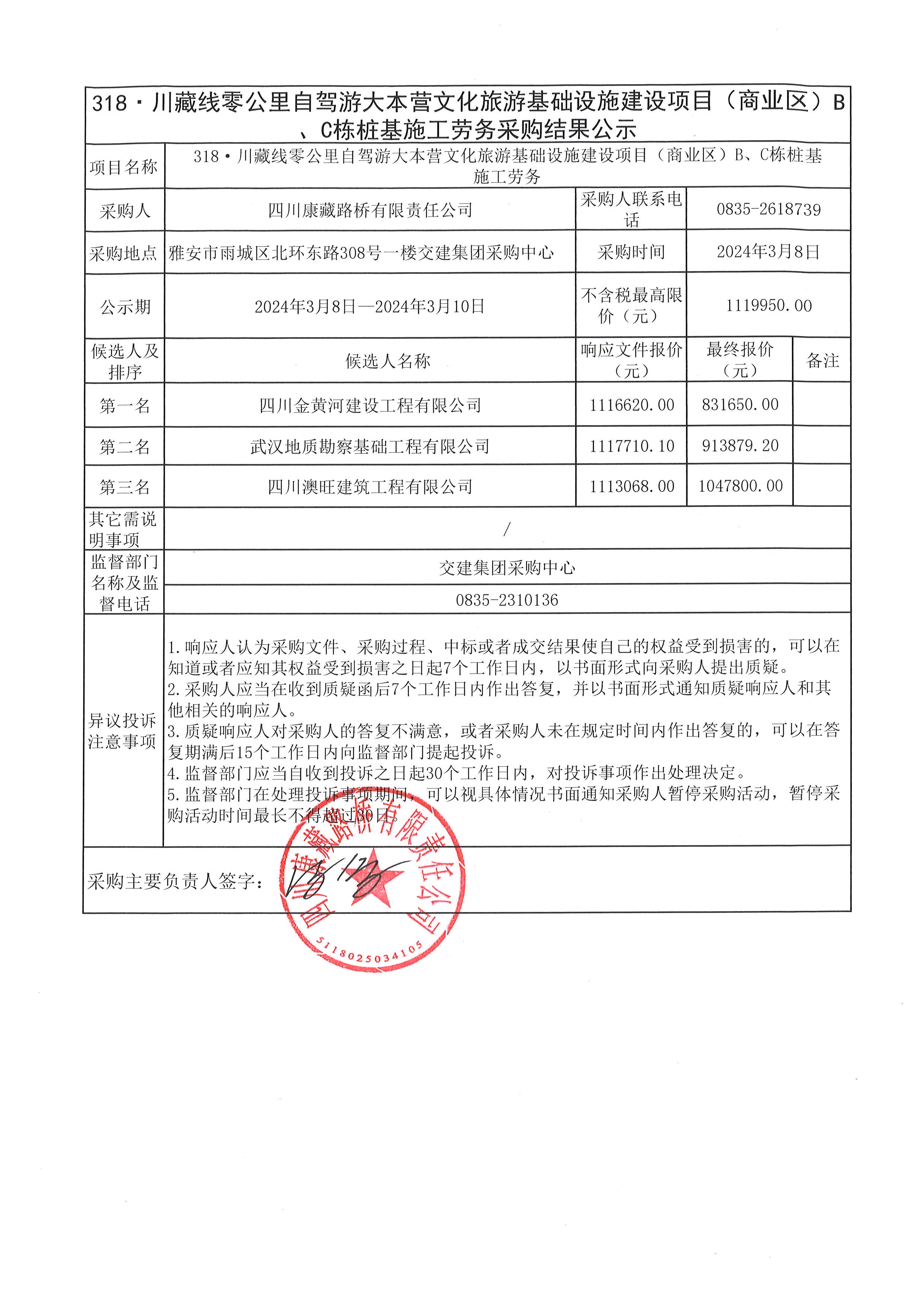 四川康藏路橋有限責任公司318·川藏線零公里自駕游大本營文化旅游基礎設施建設項目(商業(yè)區(qū))B、C棟預制管樁采購結果公示