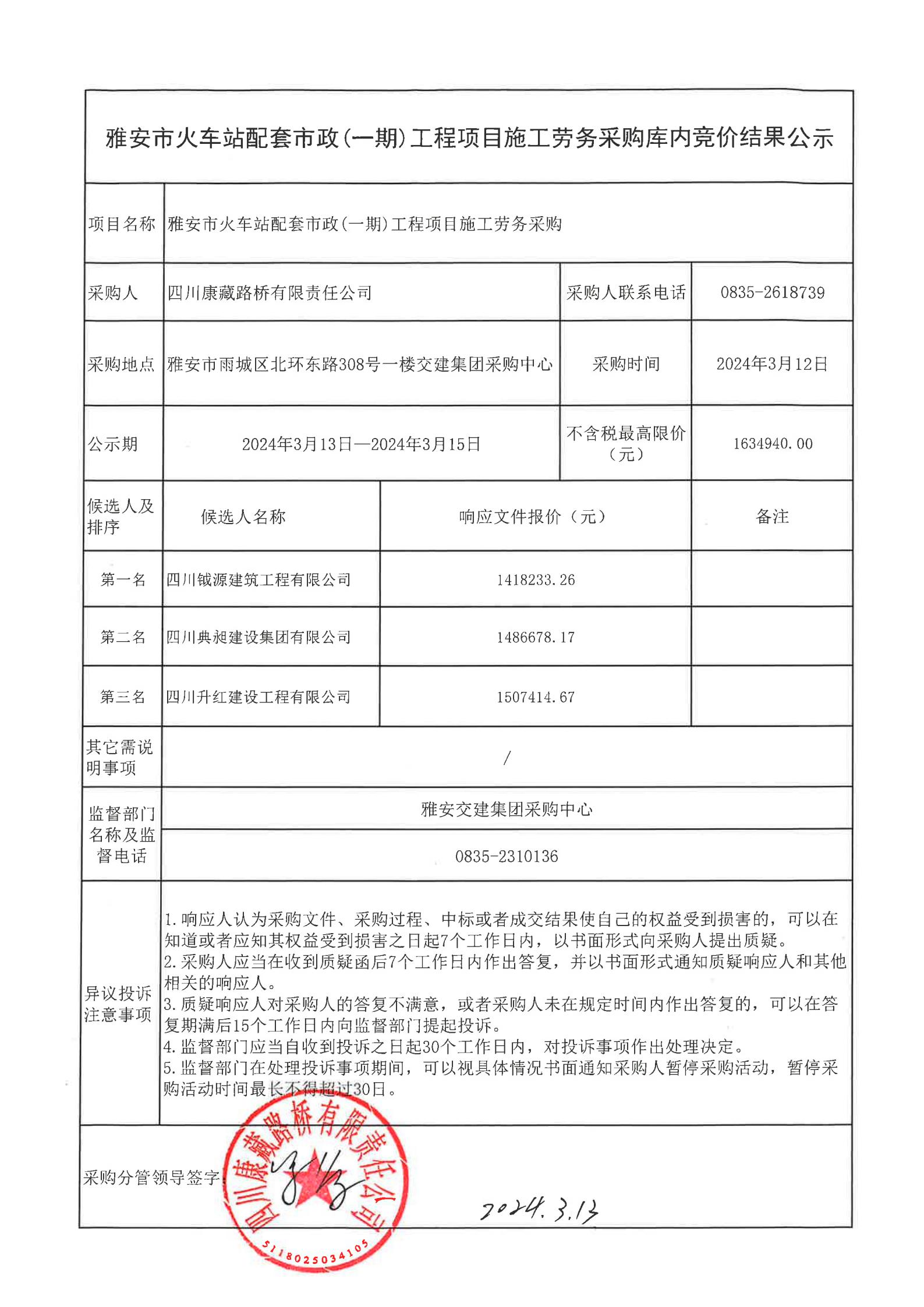 四川康藏路橋有限責任公司雅安市火車站配套市政(一期)工程項目施工勞務(wù)采購結(jié)果公示